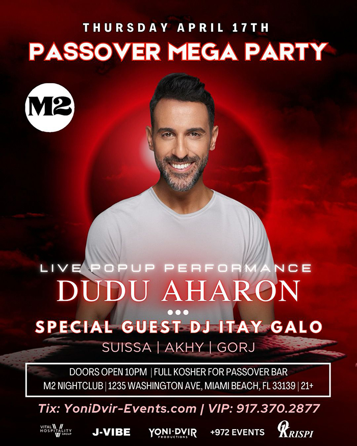 הזמר דודו אהרון כבר מעל ל 20 שנה בטופ של המוסיקה הישראלית עם עשרות להיטים ומאות הופעות שמחות! דודו מגיע להופעה חד פעמית במיאמי ביץ בחול המועד פסח… על המוסיקה יפקד אחד מהדיג׳יים הטובים והמצליחים בישראל איתי גאלו! רכשו כרטיסים ותהנו ממסיבת פסח המרכזית של מיאמי…
