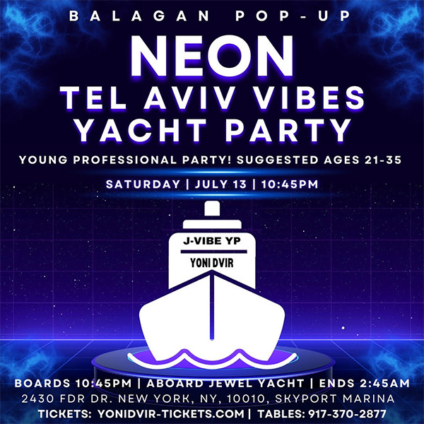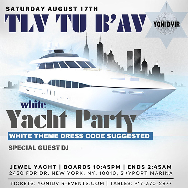 הצטרפו למאות ישראלים ויהודים למסיבות יאכטה מטורפות בים היפיפה של מנהטן… מסיבת קיץ ביולי ומסיבת ט״ו באב (חג האהבה היהודי) בחודש אוגוסט רכשו עכשיו כרטיסים… ים, דיג׳יים ישראלים, פסל החירות, אלכוהול, ואנשים יפים, מה צריך יותר מזה??